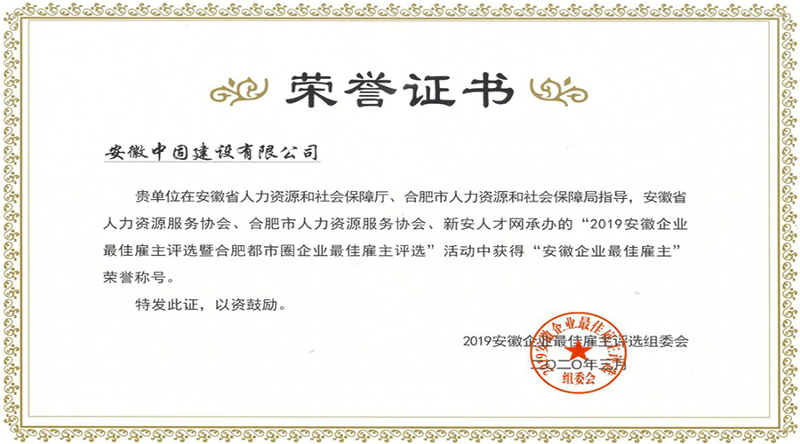 近日,由安徽省人力資源和社會保障廳、合肥市人力資源和社會保障局指導(dǎo),安徽省人力資源服務(wù)協(xié)會、合肥市人力資源服務(wù)協(xié)會、新安人才網(wǎng)承辦的“2019安徽企業(yè)最佳雇主評選暨合肥都市圈企業(yè)最佳雇主評選”活動中,安徽中固建設(shè)有限公司榮獲“安徽企業(yè)最佳雇主”榮譽稱號。