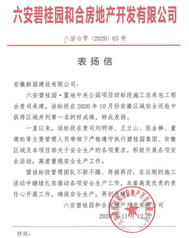 2020年10月份,該標(biāo)段在碧桂園安徽區(qū)域安全巡檢中獲得區(qū)域并列第一名的好成績。