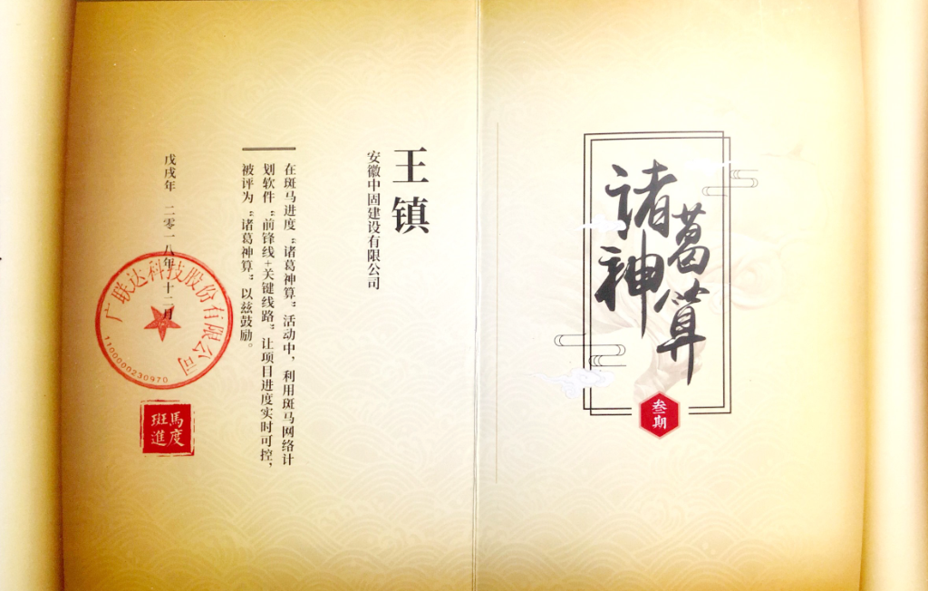 2019年1月11日,他代表公司參加廣聯(lián)達(dá)科技股份有限公司舉辦的“諸葛神算”活動,使用了“前鋒線+關(guān)鍵線路”這一應(yīng)用,為項(xiàng)目進(jìn)度糾偏提供技術(shù)支持,榮獲了“進(jìn)度管控優(yōu)秀項(xiàng)目”獎。