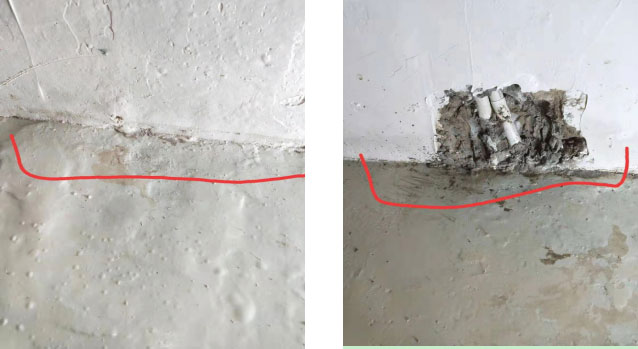 經現(xiàn)場勘查樣板房負一層車庫部位積水嚴重,將積水清掃后觀察,發(fā)現(xiàn)多處滲漏點。
