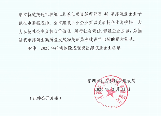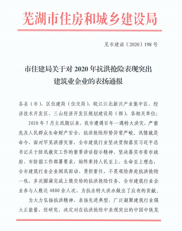 近日,蕪湖市住房和城鄉(xiāng)建設(shè)局對2020年度抗洪搶險表現(xiàn)突出企業(yè)進(jìn)行了表彰。