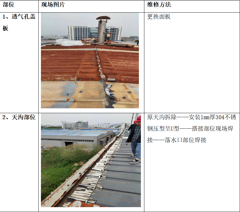 3、天溝:采用304不銹鋼壓型——拆除現(xiàn)在破損面板——安裝不銹鋼天溝——搭接部位焊接。