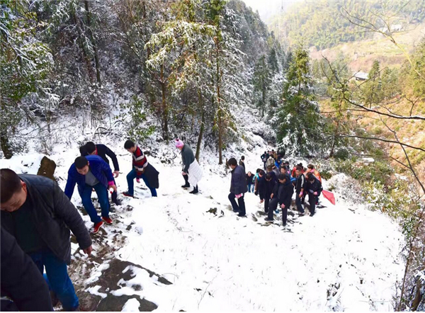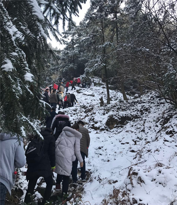 “靈山九華,美在花臺”,雪花更是為花臺增添了幾分誘人的仙氣,四支隊伍三百余人浩浩蕩蕩出發(fā),平坦處,小伙伴們還打起了雪戰(zhàn)。出發(fā)后半小時左右,山路開始陡峭起來,厚厚的積雪給隊伍帶來了很大的阻礙,我們也真真應(yīng)了魯迅先生那句“世上本沒有路,走的人多了也便成了路”。隨著海拔的升高,呼吸越來越急促,腳步也沉重起來。地面出現(xiàn)了大片積雪,路越來越不好走,大家小心謹慎的一步步向前。這時,沒有聲音沒有命令,男生自覺地開始幫助起了女生,穿專業(yè)登山服的人開始走在了前面,遇到路滑的地方他們自動清理,遇到陡坡,他們主動站在旁邊幫著拉一把、推一把或是小心攙扶。走在前面的人遇到路滑的地面會第一時間提醒身后的人,甚至在旁邊留字提醒……